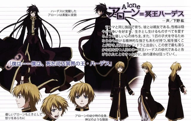 Prior to his transformation into Hades, Alone was a pale-skinned youth with a slender frame, shoulder-length blonde hair, with long bangs (in a style similar to his sister, Sasha) and blue eyes. He wore a long black coat lined with gold on the collar, white pants, a long purple ribbon tied to the waist, white pants and black espadrilles. Moreover, Alone wears a necklace with a teardrop ornament in the middle. The origin of this necklace is unknown, but it could be a memory of his childhood or the orphanage.
