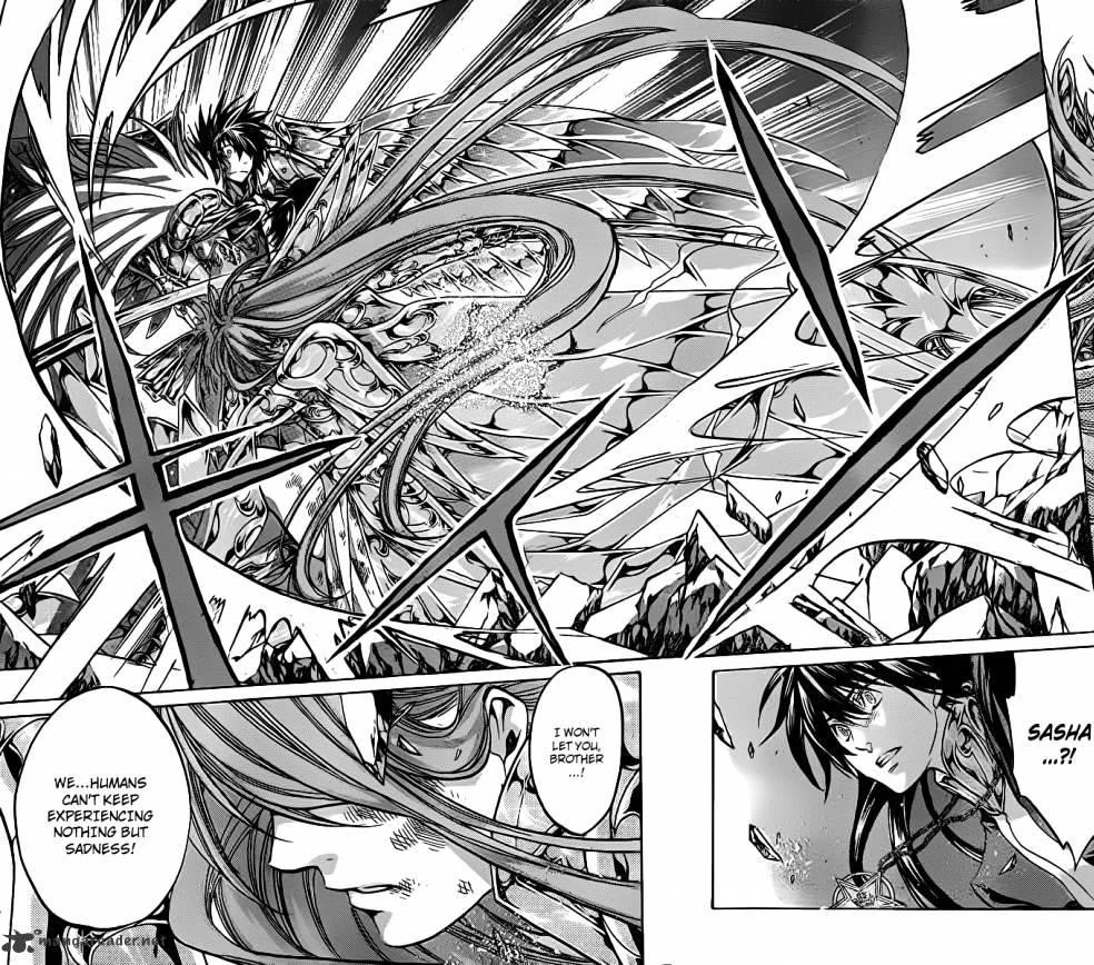Alone decided to get serious, and comments that Tenma does not possesses enough sorrow. Alone decides to unleashes his deadly overwhelming powers to attempts to erase the lives of Shion and Dohko, whose are both knocked out, but Sasha, with Athena's armor, arrives just in time and manages to nullified Alone's attack, thus saving Tenma's life. Sasha tells Alone that people makes connection from the death, the living must live on and protect and support one another, and Tenma states that if Alone forget about this then he won't be able to save the world. Tenma and Sasha attempts to attacks Alone, but Alone comments that they are foolish and absorbs Tenma and Sasha's attacks and redirects its back to straight to them, causing Tenma and Sasha to crashes down to the ground