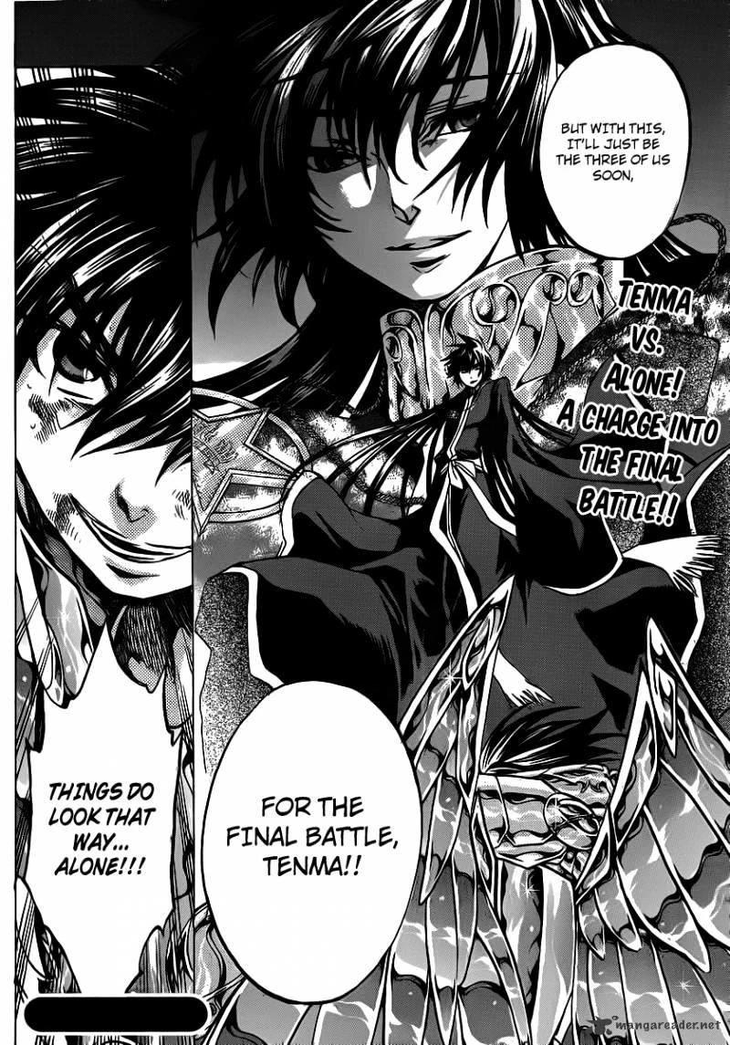 After several failed attacks, the souls of the dead are stacked to reveal the Hades' Surplice with which Alone decides to use to comfort Tenma and Sasha. And now with the Hades's Surplice, Alone will uses Tenma and Sasha's lives to complete his method of salvation. Alone uses the power of Hades's sword, and with a single slash, Alone brought forth this much force to causing Tenma and Sasha pain and brought them to the ground. But despite the injuries, Tenma tells Sasha that he will keep going, and that he know if he didn't express this then the battle won't begin like Alone had intended to be. Alone replied by claims that the battle had started already and that there're nothing to hear from Tenma. Tenma figures Alone's aloof replied was his way to forcefully end the discussion from his side, while Alone claims that it's all more useless at this point and there're nothing Tenma can actually do. Alone took it literally by warning Tenma neither your voice or fist reach him with a warning slash from Hades's sword, causing Tenma staggered backward in pain and that he already expect this from a God's Cloth. But Tenma still standing and claims that Alone hadn't severed the connection yet, and that there is a voice calling him and he pretty sure that Alone. To which Alone replied by straight up stabbing Tenma with his sword, but Tenma just look at Alone and comments he hadn't changed and that Tenma voice is reaching him. And that it's gonna Tenma who punched Alone, and Alone and Tenma starts trading blows