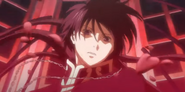 Alone then considers the situation Aspros is in after the battle with his brother, and Aspros take this chances to dashes forward and attempts to bring his fist down on the host of Hades. However, this attempt is unsuccessful, Alone is quick enough to nonchalantly block the former Saint Gemini Aspros's attack by using the tip of his paintbrush, much to Aspros's surpise, and effectively nullified the effectiveness of the Gemini Gold Saint's attack. Alone recognizes that although there boldness Aspros was always filled him a human being who has committed so many sins and will even attack the man who brought him back to life.
