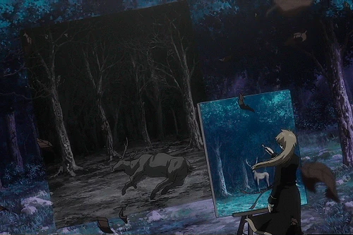Some time later, Alone goes to paint in a cathedral where meet a mysterious priest overlooking his work who questions Alone about the unfinished eyes and directs him to a location where he could find the ideal shade of red he is looking for. Taking the advice, Alone thanks the mysterious priest before leaving to find the right flower he needs to use for his painting.