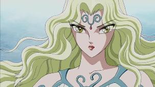 Artemis has the lunar symbol on her forehead. In addition, She wears golden armor (probably her divine armor), which covers her body elegantly. She also has a golden scepter, like spear sharp. She lives on Mount Olympus, in the Shrine of the Moon (located at the foot of the sacred mountain), protected by her warriors, the Satellites. Callisto is the commander of the Satellites and the personal guard of Artemis.