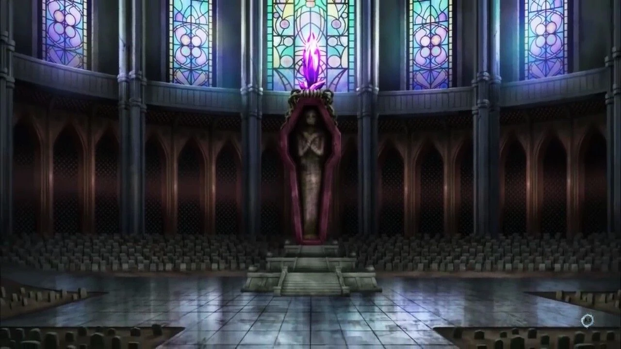 The chamber looks like a church with a real graveyard inside it guarding corpses of old asgardian warriors inside each tomb.The statue locates at its center,it is a giant coffin with a giant mummy inside it,at its top there is a purple gem that powers the chamber.The one that guards the chamber is Garmr Útgardr.